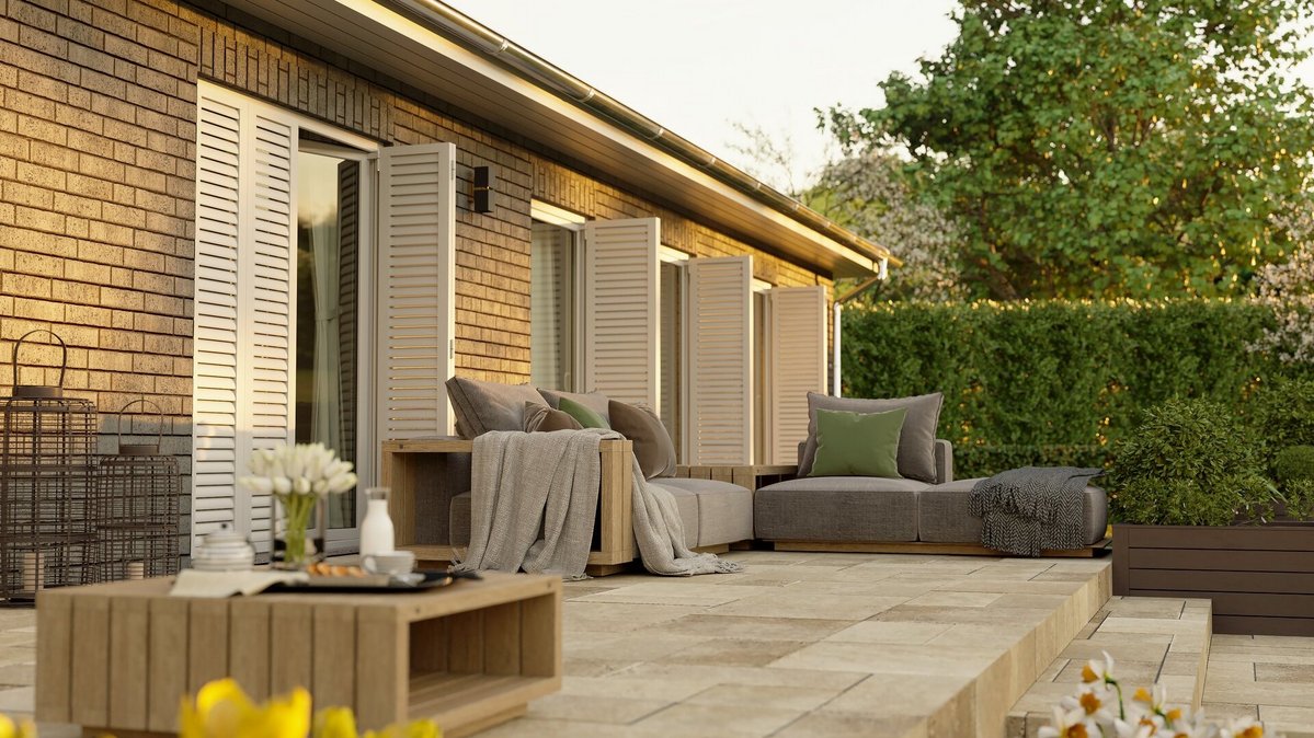 - Stufenlose Übergänge zu Terrasse und Eingang verhindern Stolperfallen