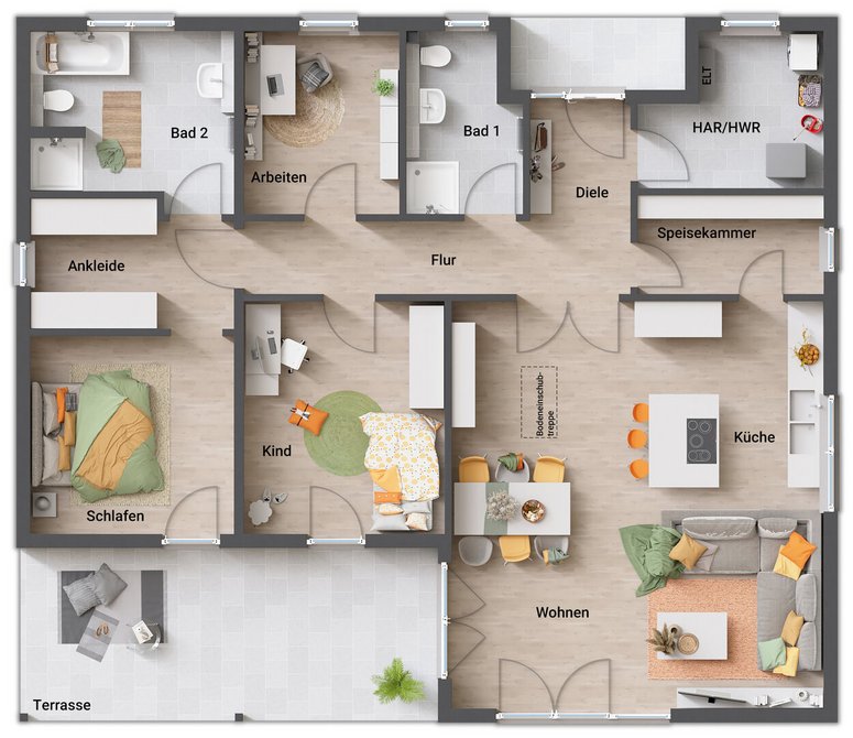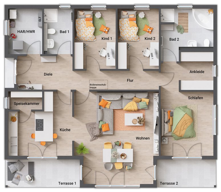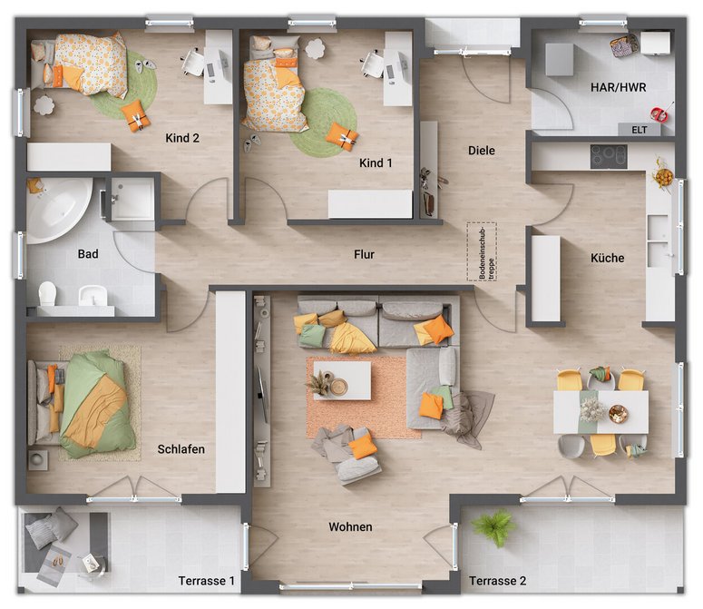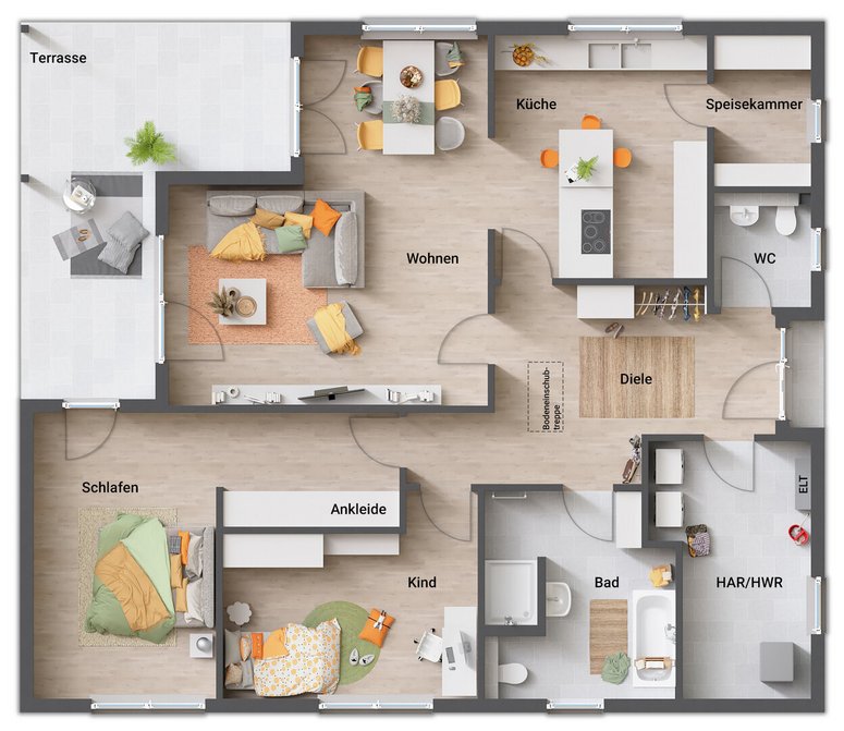 Der Bungalow 131 bietet auf einer Ebene 5 Zimmer, zwei Bäder, lichtdurchflutete Räume und viel Platz für die ganze Familie. Große Wohnküche, Gartenblick und Terrasse inklusive. Jetzt anfragen und Wohntraum verwirklichen!
