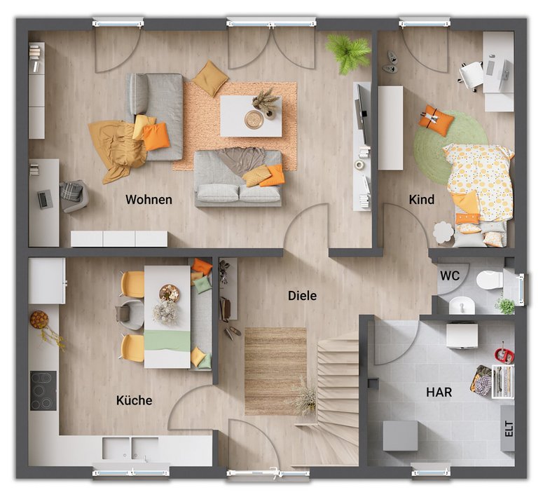 Das Flair 134 ist ein Haus für die ganze Familie mit genügend Freiraum für jeden. Die offen gestaltete Diele führt Sie direkt ins großzügig angelegte, sonnendurchflutete Wohnzimmer mit gemütlicher Essecke. Auch die Küche bietet ausreichend Platz für ein gemeinsames Familienfrühstück.
