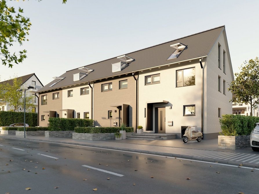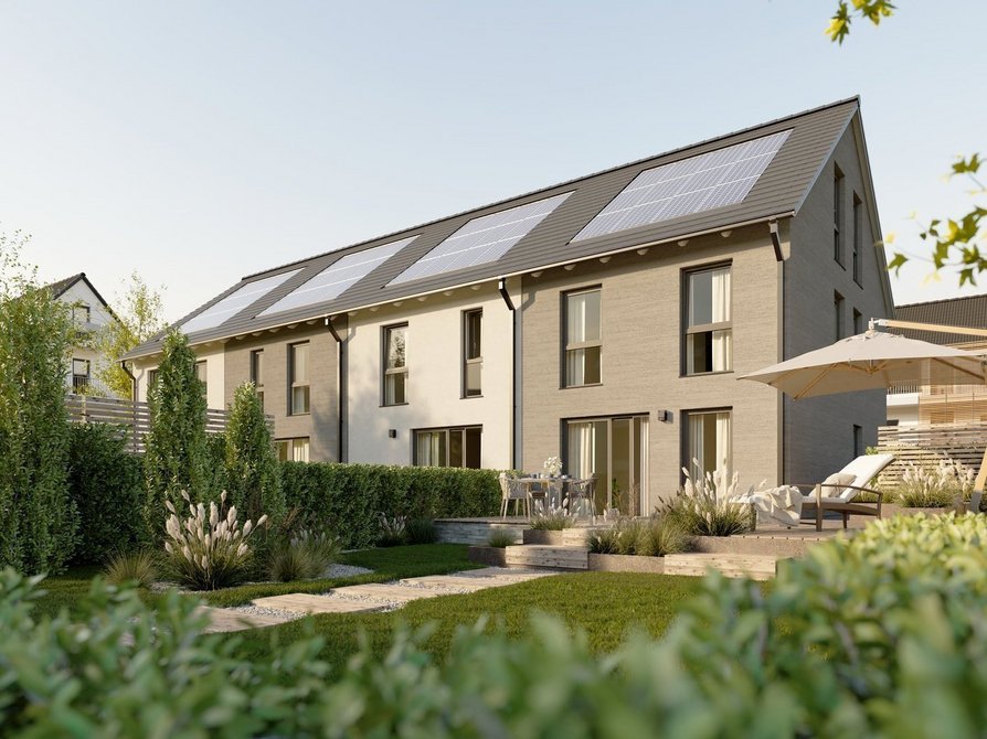 Das Reihenhaus mit vier Wohneinheiten verbindet modernes Design mit einem durchdachten Wohnkonzept. In der Novo-Ausstattung zeigt sich das Haus in klarer Architektur mit großzügigen Fensterflächen, die für lichtdurchflutete Räume sorgen. Jede Einheit bietet rund 140 Quadratmeter Wohnfläche auf drei Etagen und überzeugt mit einer offenen Grundrissgestaltung, die viel Raum für individuelle Wohnideen lässt.