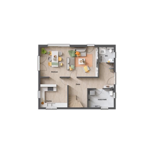 - gerade Treppe (zentral im Erdgeschoss, „teilt“ Koch- und Wohnbereich)