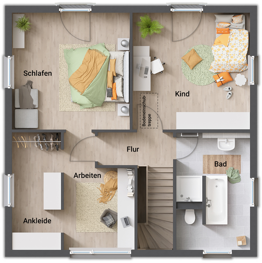 Beim Stadthaus Flair 124 mit Walmdach ist der Name Programm. Im Obergeschoss bieten drei großzügige Zimmer für alle Lebensphasen und -pläne genug Platz zur flexiblen Nutzung, ohne Dachschrägen. Ein geräumiges Badezimmer sorgt für allen erdenklichen Komfort, den sich Hausbewohner wünschen. Bei diesem intelligenten Hauskonzept freuen sich Bauherren über den offenen Wohnbereich im Erdgeschoss, indem Sie gemeinsam Erinnerungen mit der Familie schaffen.